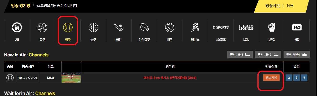 2. 화면에서 '야구' 클릭 후 아래의 월드시리즈 '시청하기'를 누르시면 시청이 가능합니다.