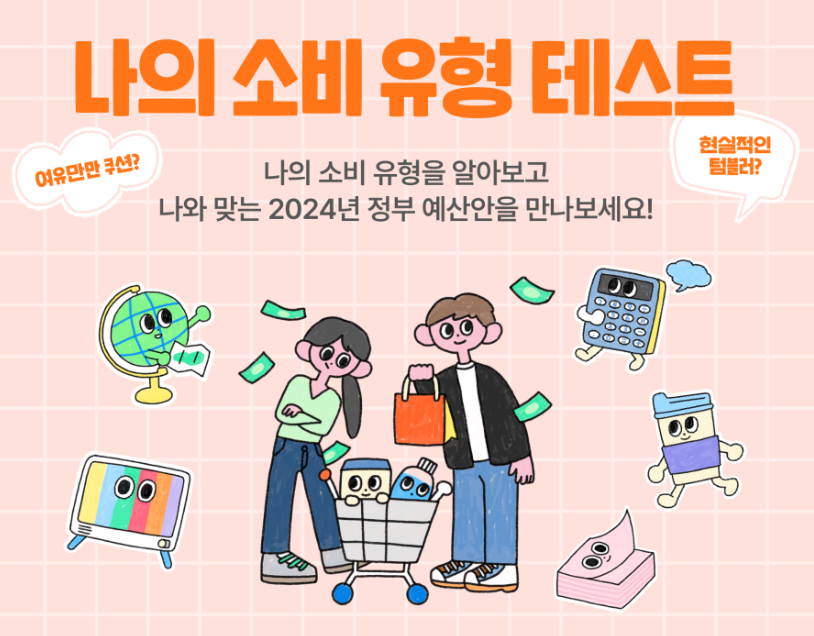 기획재정부 경제 e야기에서 시민들에게 맞는 2024년 정부 예산안을 알리고자 이벤트를 진행합니다. 기획재정부 경제 e야기에 대해 알아보시고 나의 소비 유형 테스트 이벤트에 참여하셔서 무료 커피 기프티콘 받아 가세요.