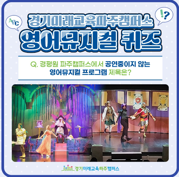 경기도평생교육진흥원의 경기미래교육파주캠퍼스에서 영어뮤지컬 공연을 하며 퀴즈이벤트를 진행합니다. 경기미래교육파주캠퍼스에서 공연하는 영어뮤지컬도 알아보시고 퀴즈 풀고 커피 기프티콘 받아 가세요.