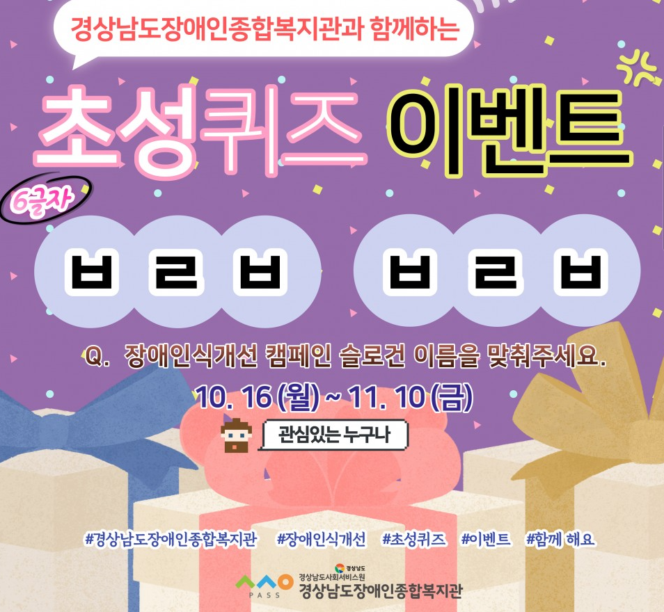 2023년 제4차 장애인인식개선 온라인 캠페인의 일환으로 경상남도장애인복지관에서 퀴즈이벤트를 진행합니다. 장애인인식개선에 대한 내용도 알아보고 퀴즈 풀고 GS25 모바일 상품권 받아 가세요.