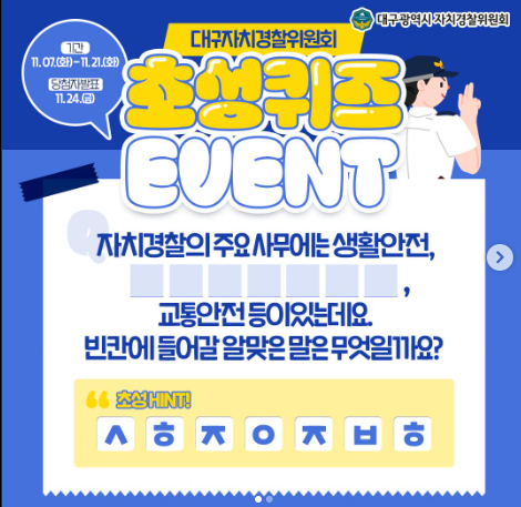 1. 아래 버튼을 눌러 대구광역시 자치경찰위원회 인스타그램 퀴즈이벤트 게시물로 이동 후 '팔로우'와 댓글로 '참여완료' 작성(댓글에 대구자치경찰에게 전하고 싶은 메시지를 포함하면 당첨 확률 UP)