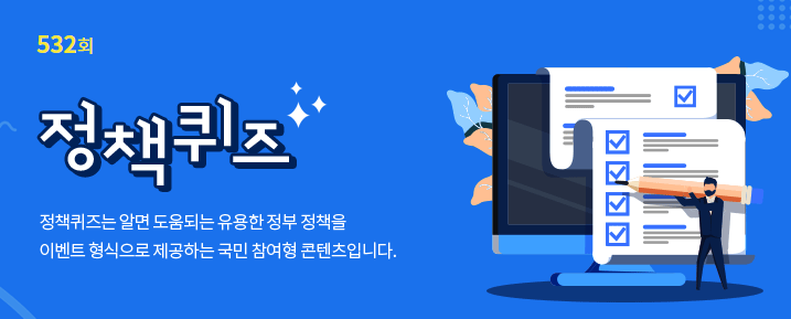 대한민국 정책브리핑에서 알면 도움 되는 유용한 정부 정책을 퀴즈이벤트 형식으로 제공하는 국민 참여형 콘텐츠인 정책퀴즈를 매주 진행하고 있습니다. 대한민국 정책브리핑에서 정책 퀴즈 풀고 치킨, 문화상품권, 스타벅스 기프티콘 등 다양한 경품 받아 가세요.