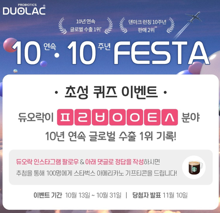듀오락에서 10주년 기념으로 퀴즈이벤트를 진행합니다. 듀오락 인스타그램에서 퀴즈 풀고 무료스타벅스 기프티콘 받아 가세요.