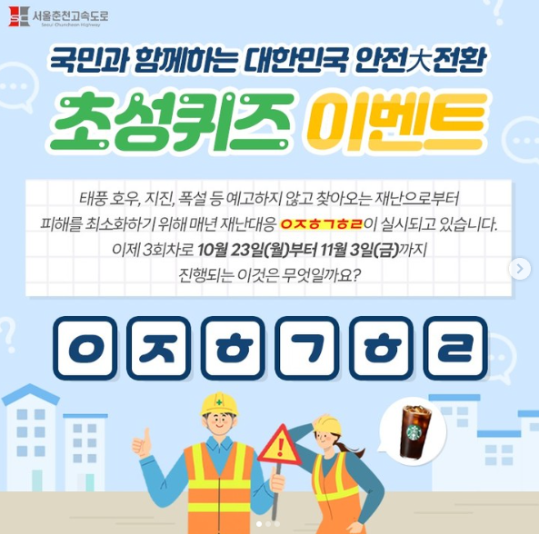 서울춘천고속도로에서 2023 재난대응 안전한국훈련을 진행하며 퀴즈이벤트를 진행합니다. 서울춘천고속도로에서 퀴즈 풀고 무료 스타벅스 기프티콘 받아 가세요.