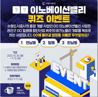 수원도시공사에서 탑동 이노베이션벨리의 기업 유치 등 성공적인 완성을 위해 홍보를 위한 퀴즈이벤트를 진행합니다. 수원도시공사에서 퀴즈 풀고 무료스타벅스 기프티콘 받아 가세요.