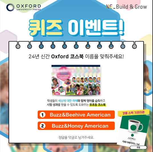 앤이 빌드 앤 그로우에서 2024년 신간 Oxford 코스북을 발간한 기념으로 퀴즈이벤트를 진행합니다. 앤이 빌드 앤 그로우에서 퀴즈 풀고 무료 스타벅스 기프티콘 받아 가세요.