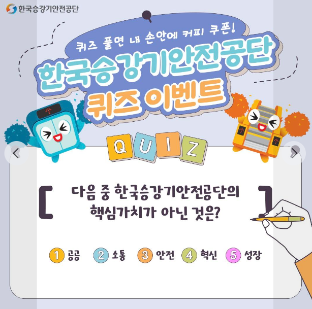 이상으로 한국승강기안전공단에서 진행하는 퀴즈이벤트에 대해 알아보았습니다. 이 글 보고 퀴즈이벤트 참여하시는 모든 분들이 당첨되셨으면 좋겠습니다.