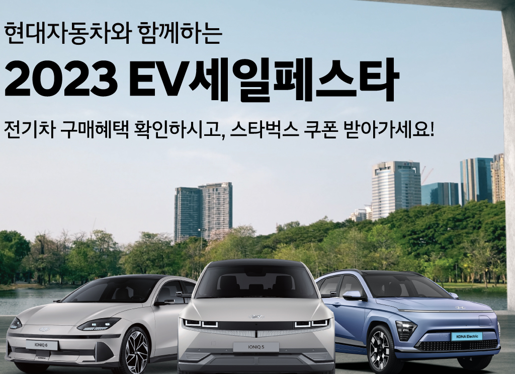 정부에서 전기차 구매가 줄어들자 구매보조금 지원을 확대함과 동시에 현대자동차에서도 일부 전기차 모델의 가격을 2023년 연말까지 한시적으로 할인해 주는 2023 EV 세일페스타를 진행합니다. 이를 기념하여 2023 EV 세일페스타 퀴즈이벤트를 진행합니다. 현대자동차에서 퀴즈 풀고 무료 스타벅스 기프티콘 받아 가세요.