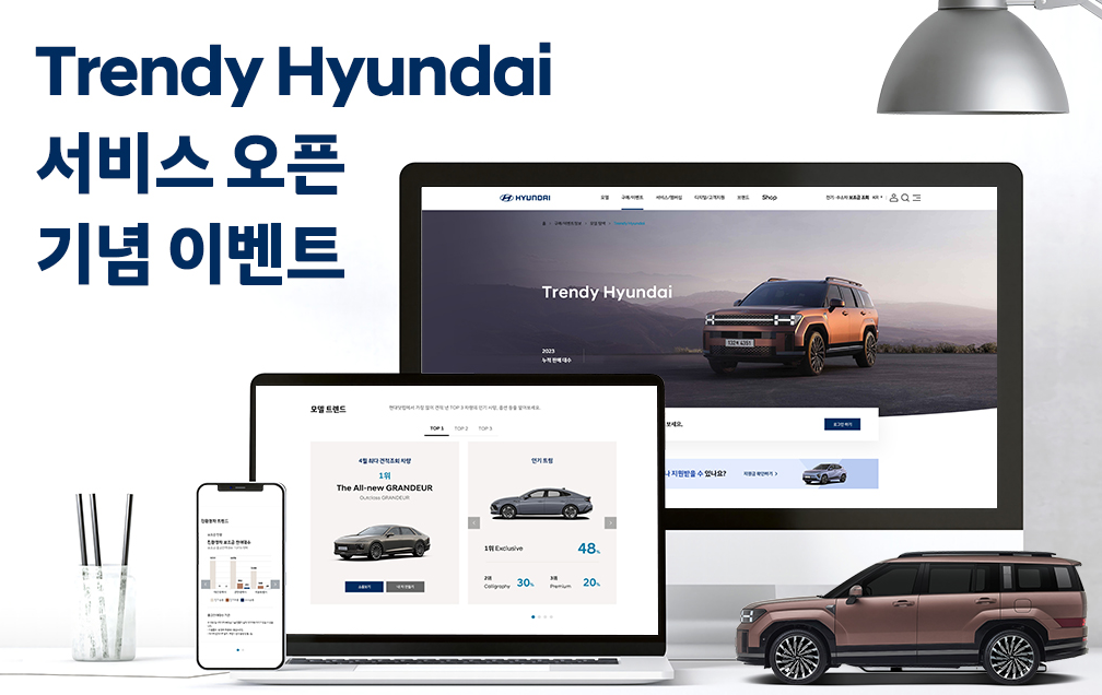 현대자동차에서 'Trendy Hyundai' 오픈 기념 이벤트로 퀴즈이벤트를 진행합니다. 새롭게 오픈하는 Trendy Hyundai에 대해서도 알아보시고 퀴즈도 풀고 아이패드와 다양한 경품들 받아 가세요.