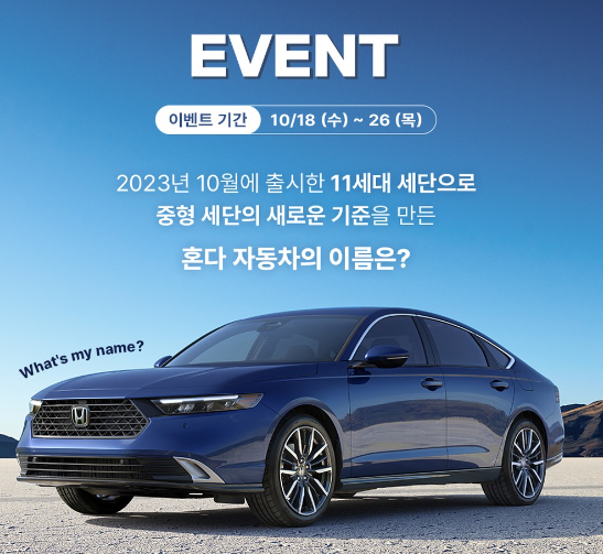 혼다코리아에서 2023년 10월 출시한 11세대 세단을 기념하고 홍보하고자 퀴즈이벤트를 진행합니다. 혼다코리아 인스타그램에서 퀴즈 풀고 무료스타벅스 기프티콘 받아 가세요.