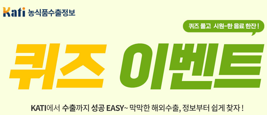 Kati 농식품수출정보에서 농식품수출정보에 대해 알리고자 퀴즈이벤트를 진행합니다. Kati 농식품수출정보에 퀴즈 풀고 무료 스타벅스 기프티콘 받아 가세요.