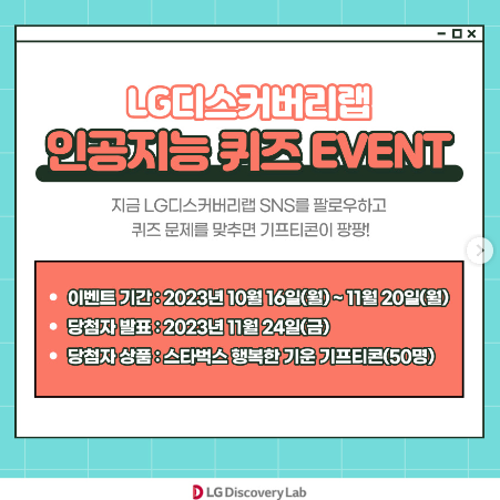 LG디스커버리랩 인공지능 퀴즈이벤트를 진행합니다. LG디스커버리랩에서 퀴즈 풀고 무료스타벅스 기프티콘 받아 가세요.