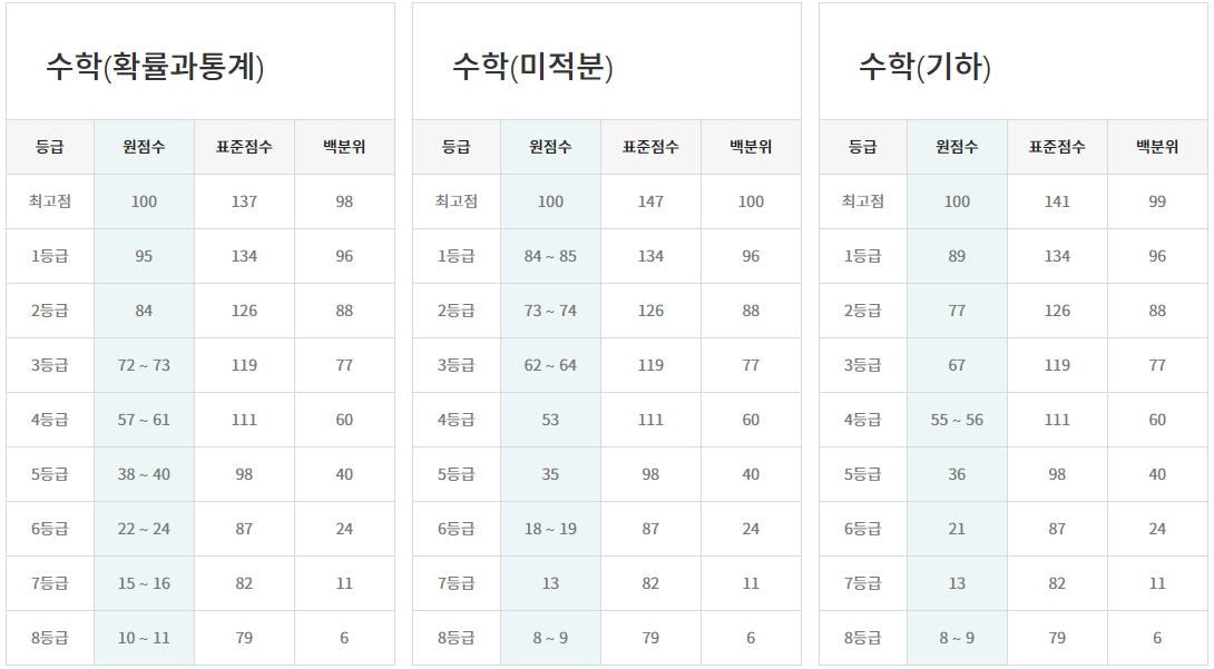 ※ 메가스터디와 EBS의 등급 컷과 비교해 보세요.