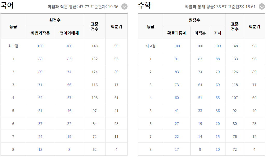 ※ 메가스터디와 이투스의 등급 컷과 비교해 보세요.