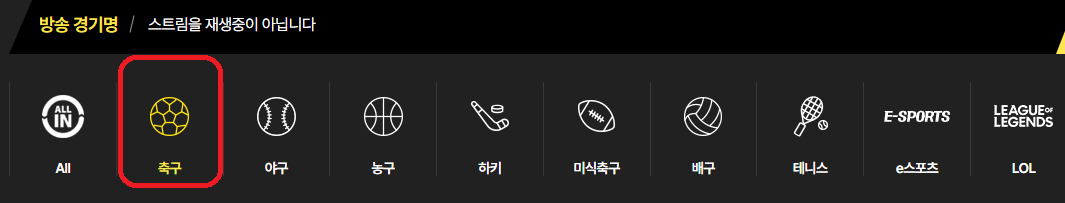 2. 화면에서 '축구' 클릭 후 아래의 대한민국 VS 북한에서 '시청하기'를 누르시면 중계 시청이 가능합니다.