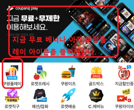 ③ 앱에서 지금 무료+무제한 이용해 보세요 베너나 쿠팡플레이 아이콘을 클릭합니다.