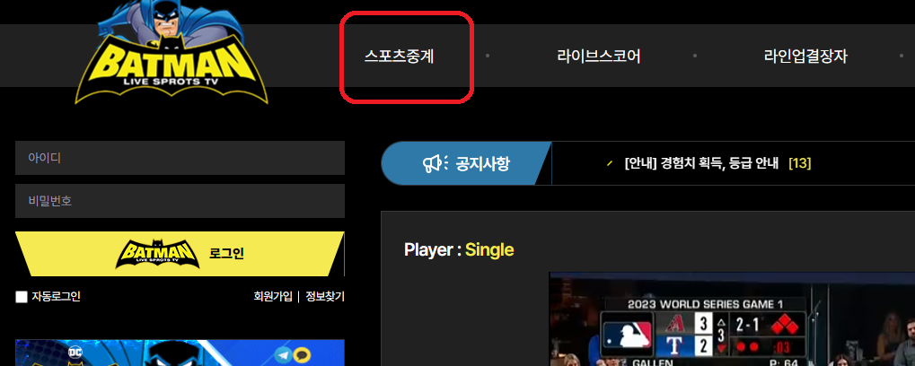 1. 아래의의 '실시간 시청하기' 버튼을 눌러 홈페이지로 이동 후 '스포츠중계'를 클릭합니다.
